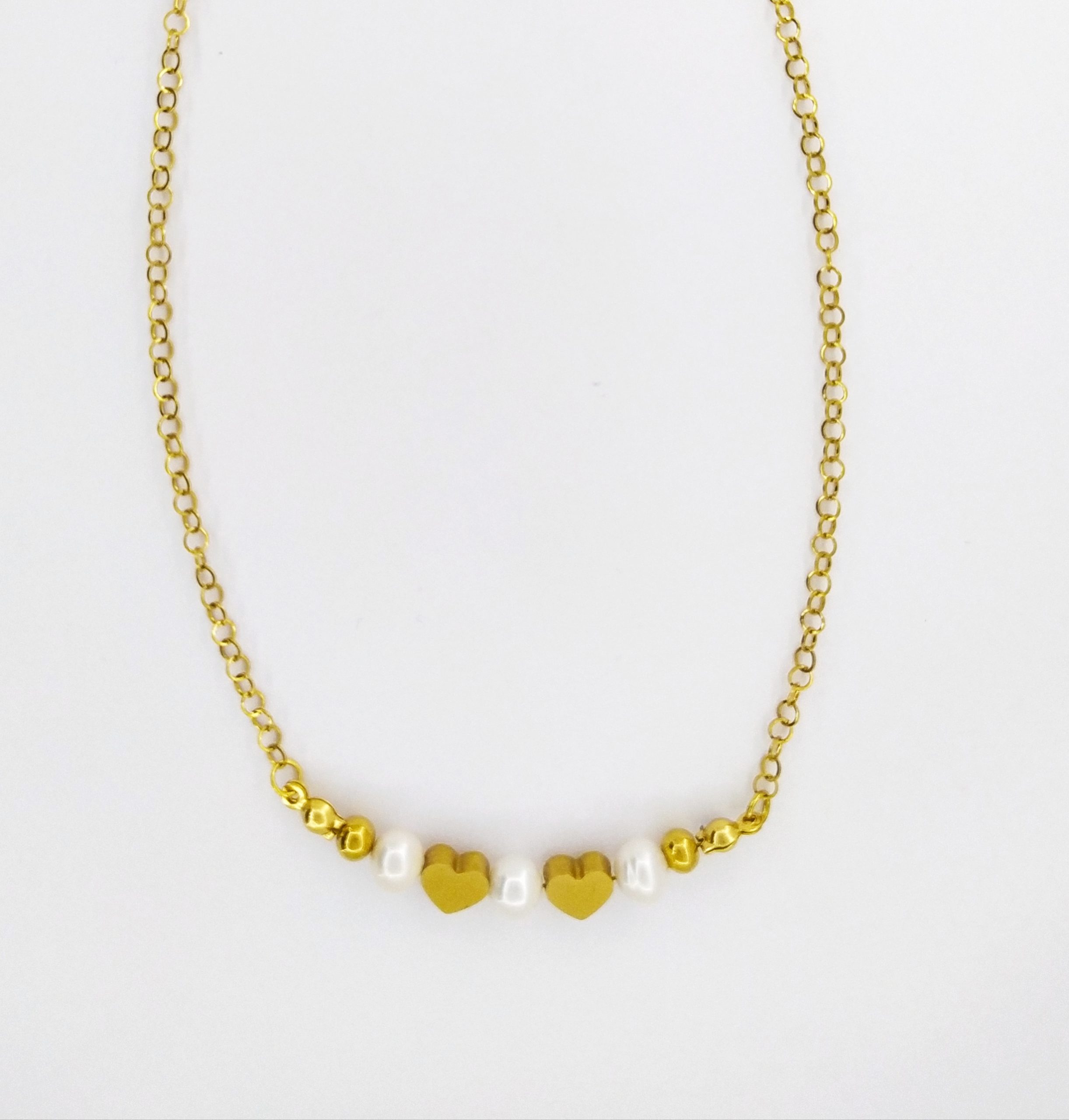 Collar dorado en acero y perlas pequeñas en el centro con unos corazoncitos pequeños de acero.
