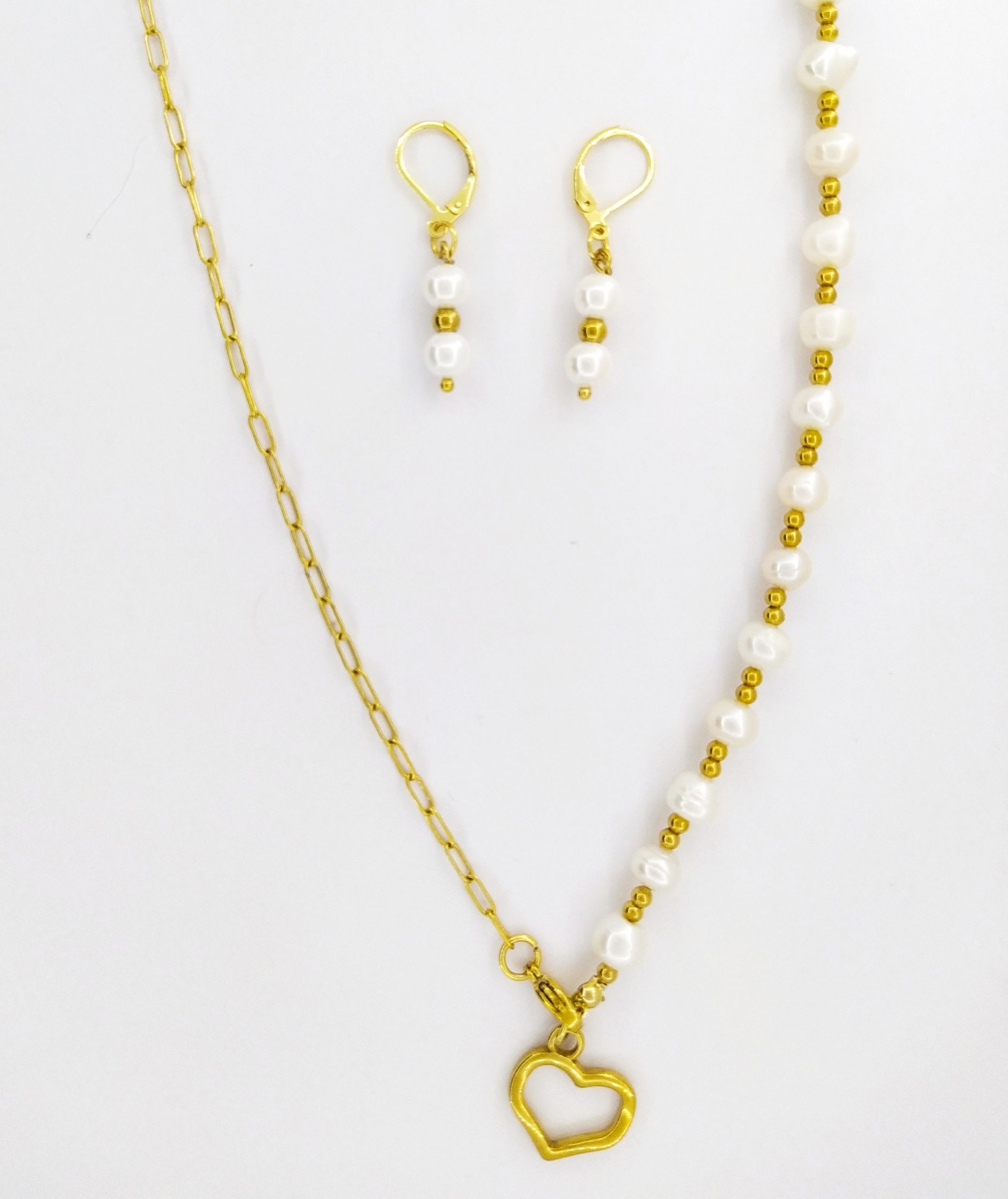 collar mitad en perla de rio, balines en acero dorado y la otra mitad en cadena guresa y dije de corazon en acero.