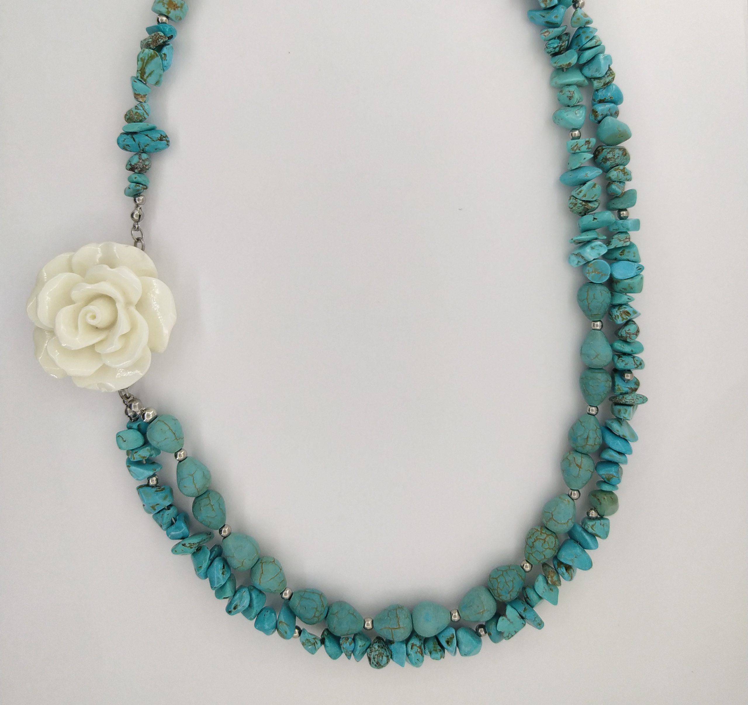 Collar doble en piedra picada y ovalada turquesa y flor blanca en acrilica y balines en acero plateado. Conexión interior en forma de joya.