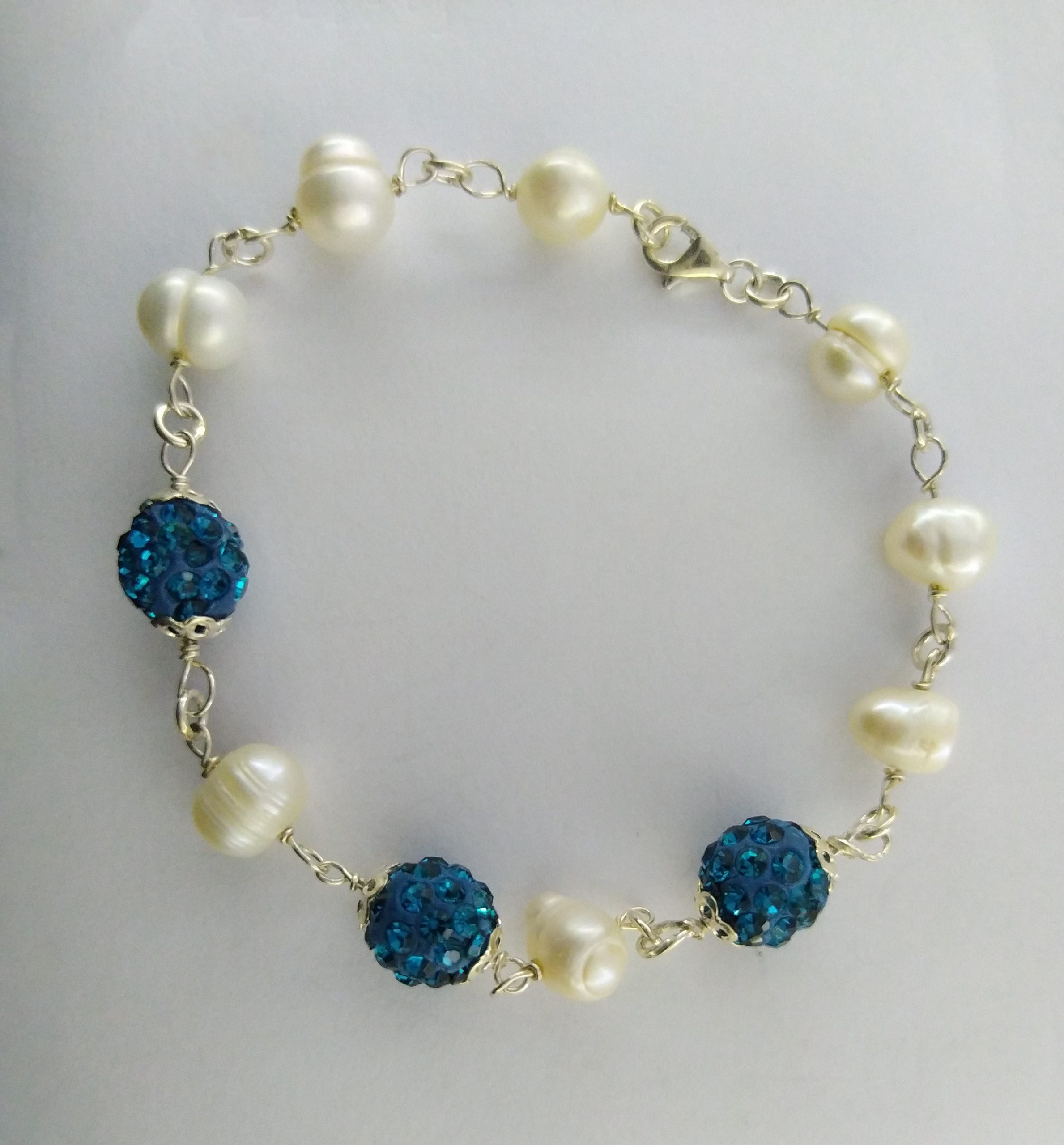 Pulsera elaborada a mano con esferas bola de fuego azul de 8mm perla natural , engarzado con alambre y argollas en plata ley 925 de 21cm de largo