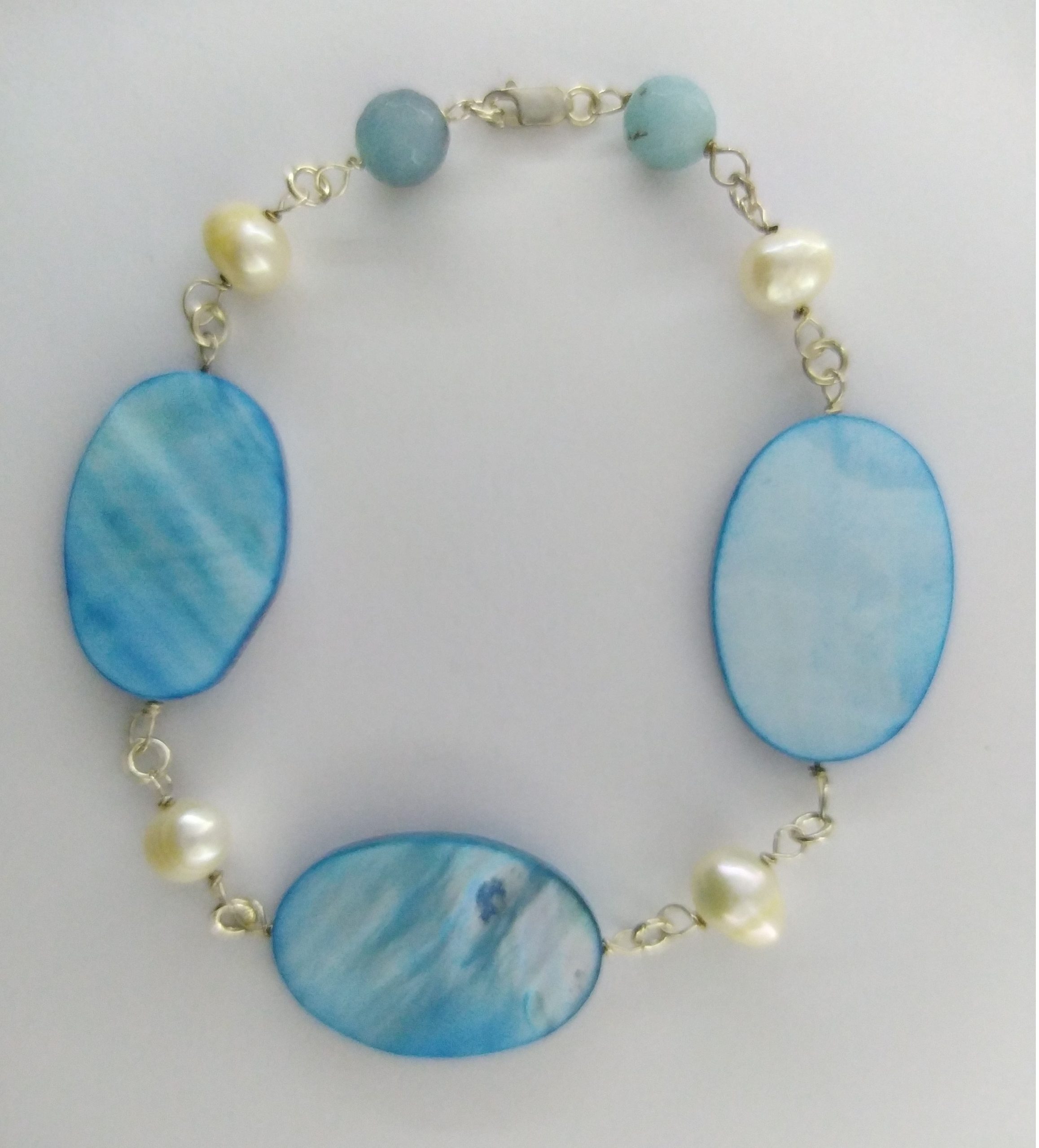Pulsera elaborada a mano con esferas Agata azul de 8mm, perla natural y ovalos planos en nacar azul, engarzado con alambre y argollas en plata ley 925 de 20cm de largo