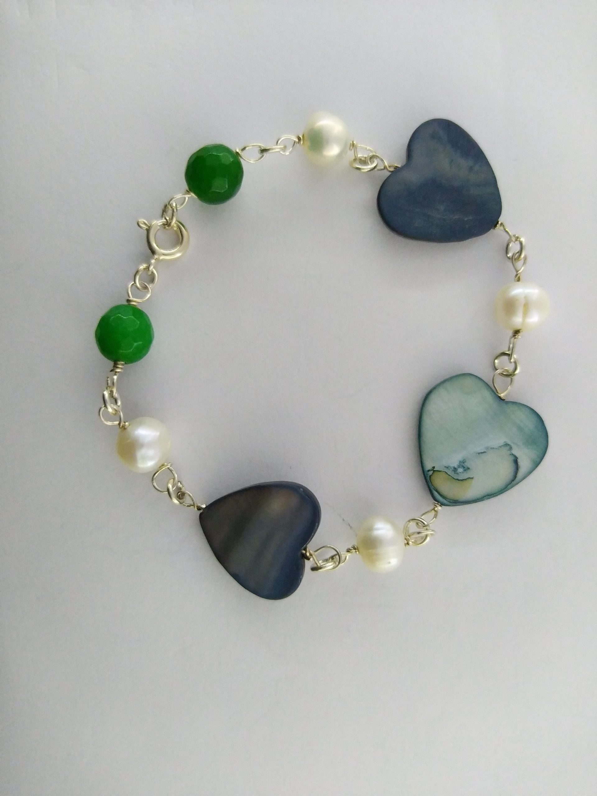 Collar elaborado a mano con esferas de Agata verde , Nacar, Perlas de Rio y engarzado con alambre y argollas en plata ley 925 de 67cm de largo