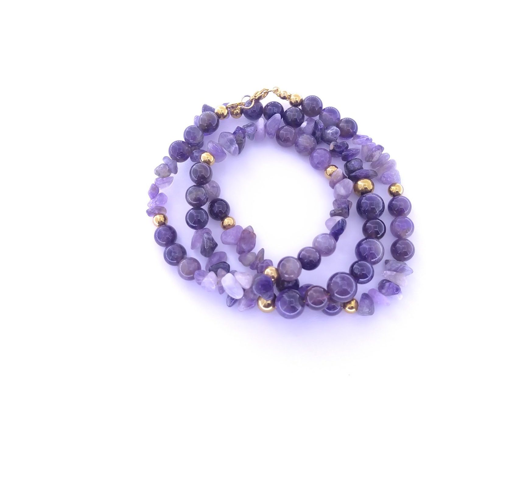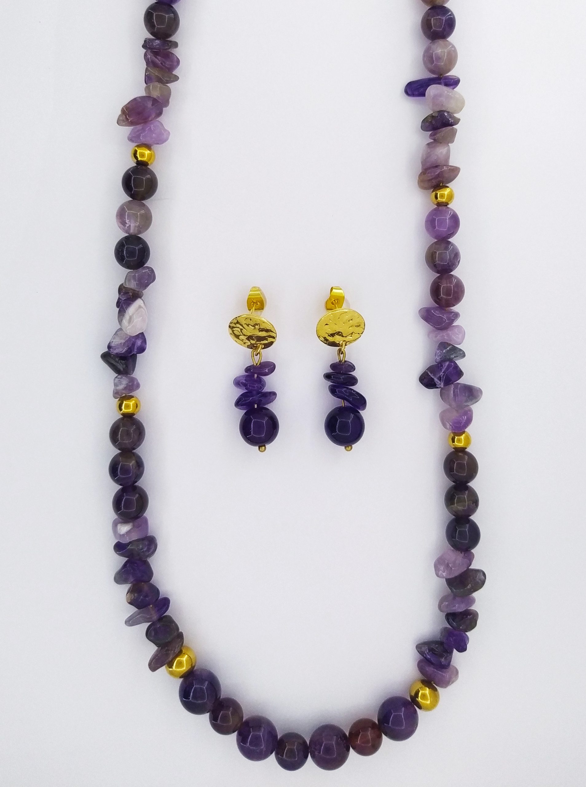 Collar en piedra amatista picada y redonda con balines en acero dorado y un par de aretes en el mismo material del collar.