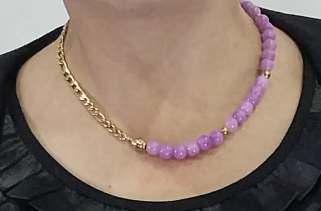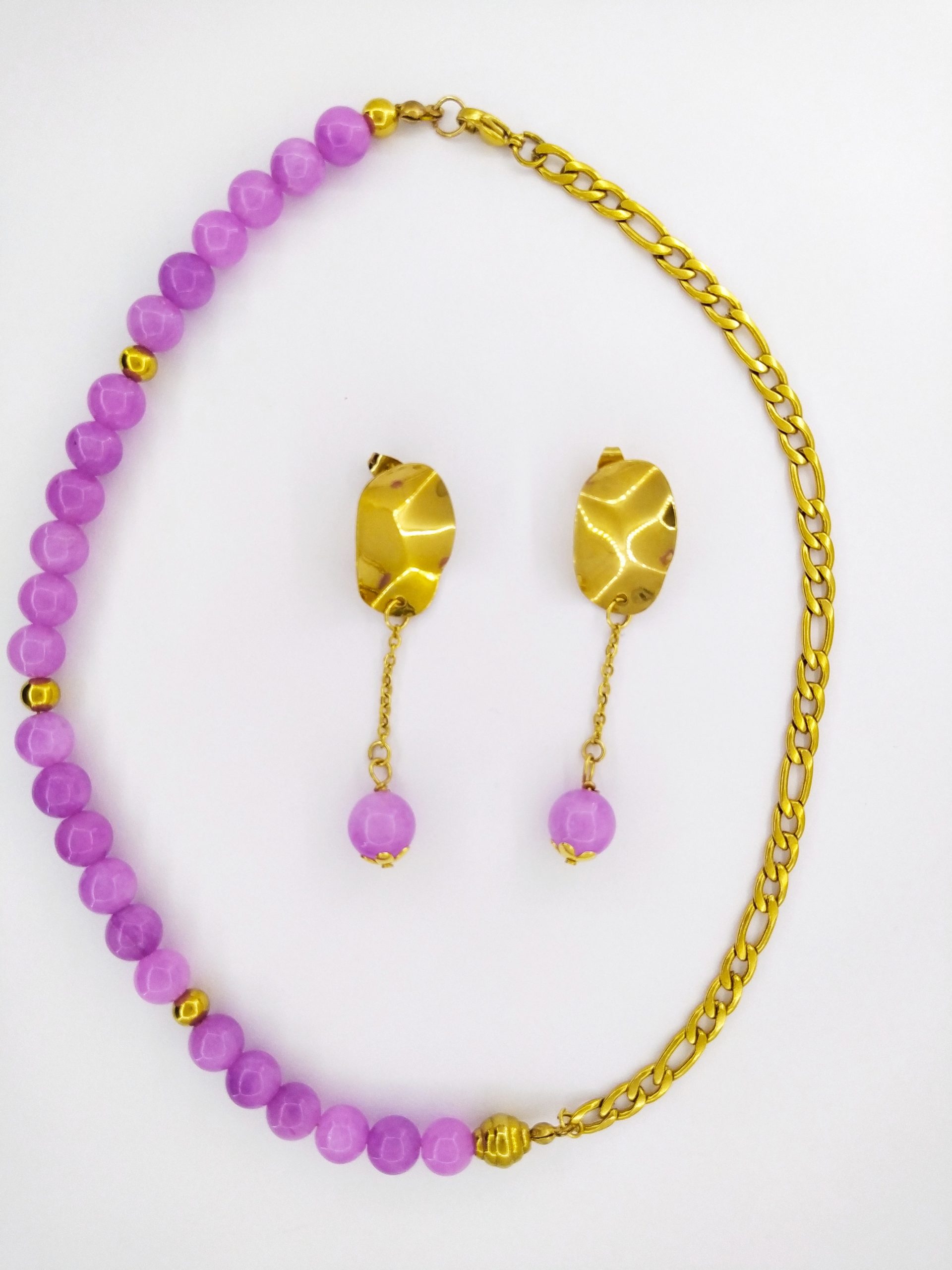 Collar en piedra natural amatista claro con balines en acero dorado y cadena en acero dorado