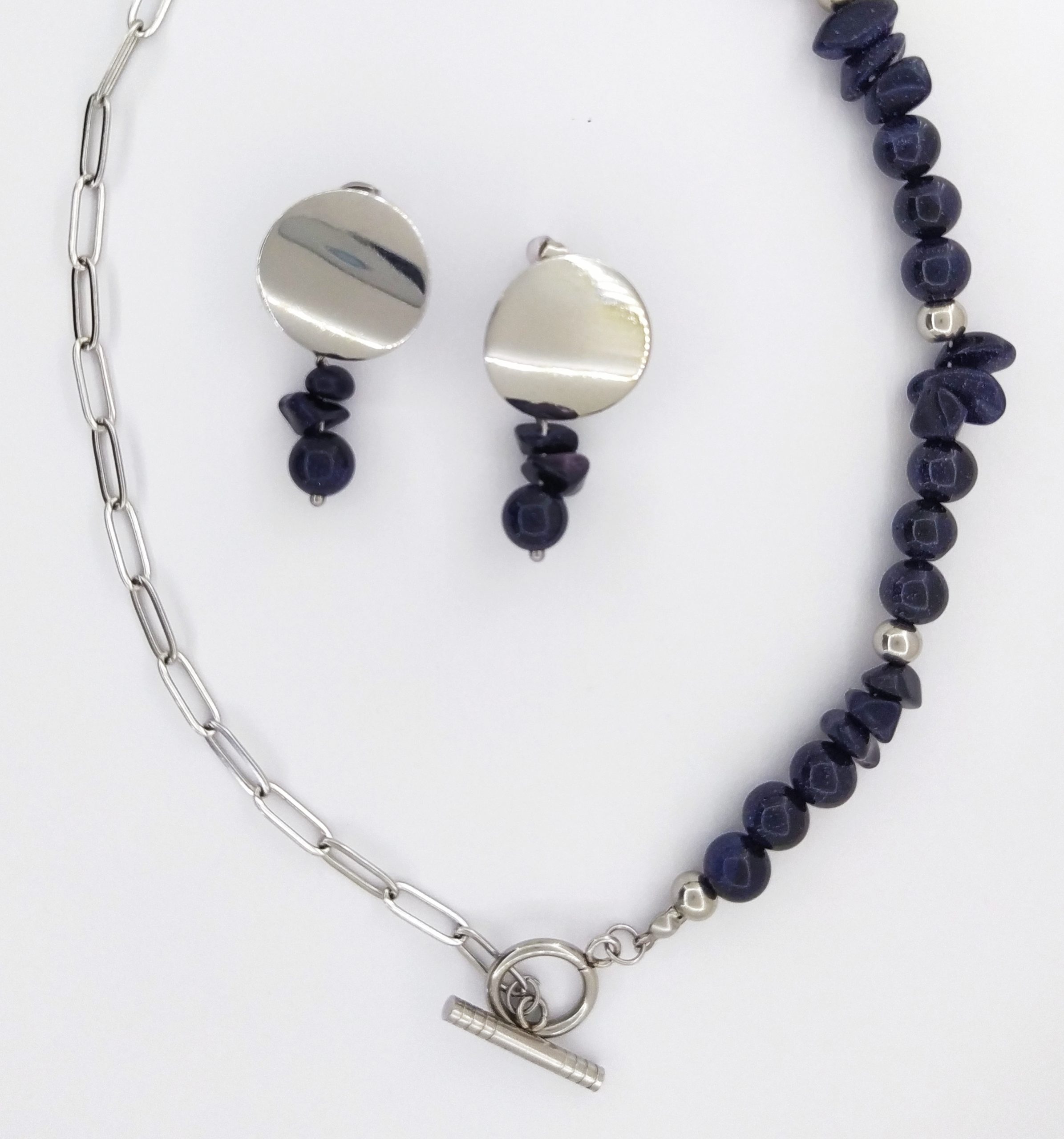 Set de collar y topos con diseño moderno en piedra natural lluvia de plata (picada y redonda) y cadena en acero plateado. Estilo urbano con brillo sutil y fuerza mineral.