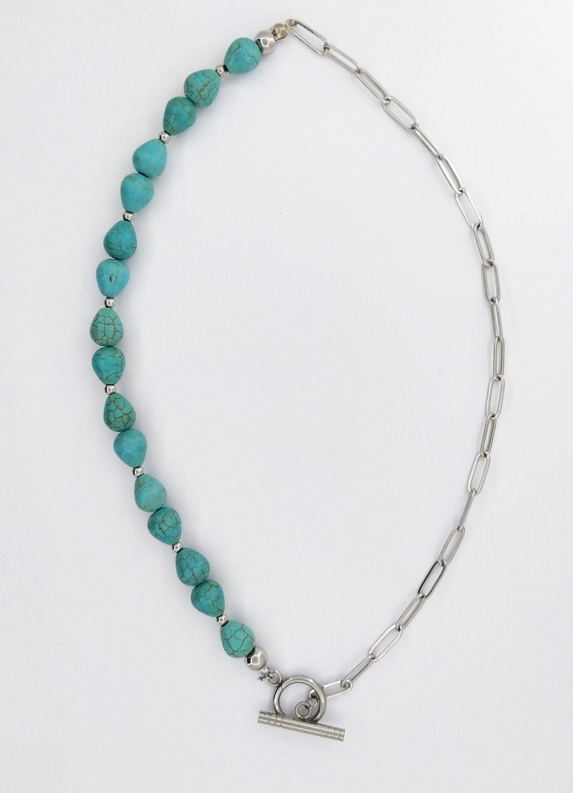Collar mitad acero plateado y la otra mitad en piedra natural azul turquesa el cierre es tambien su dije.