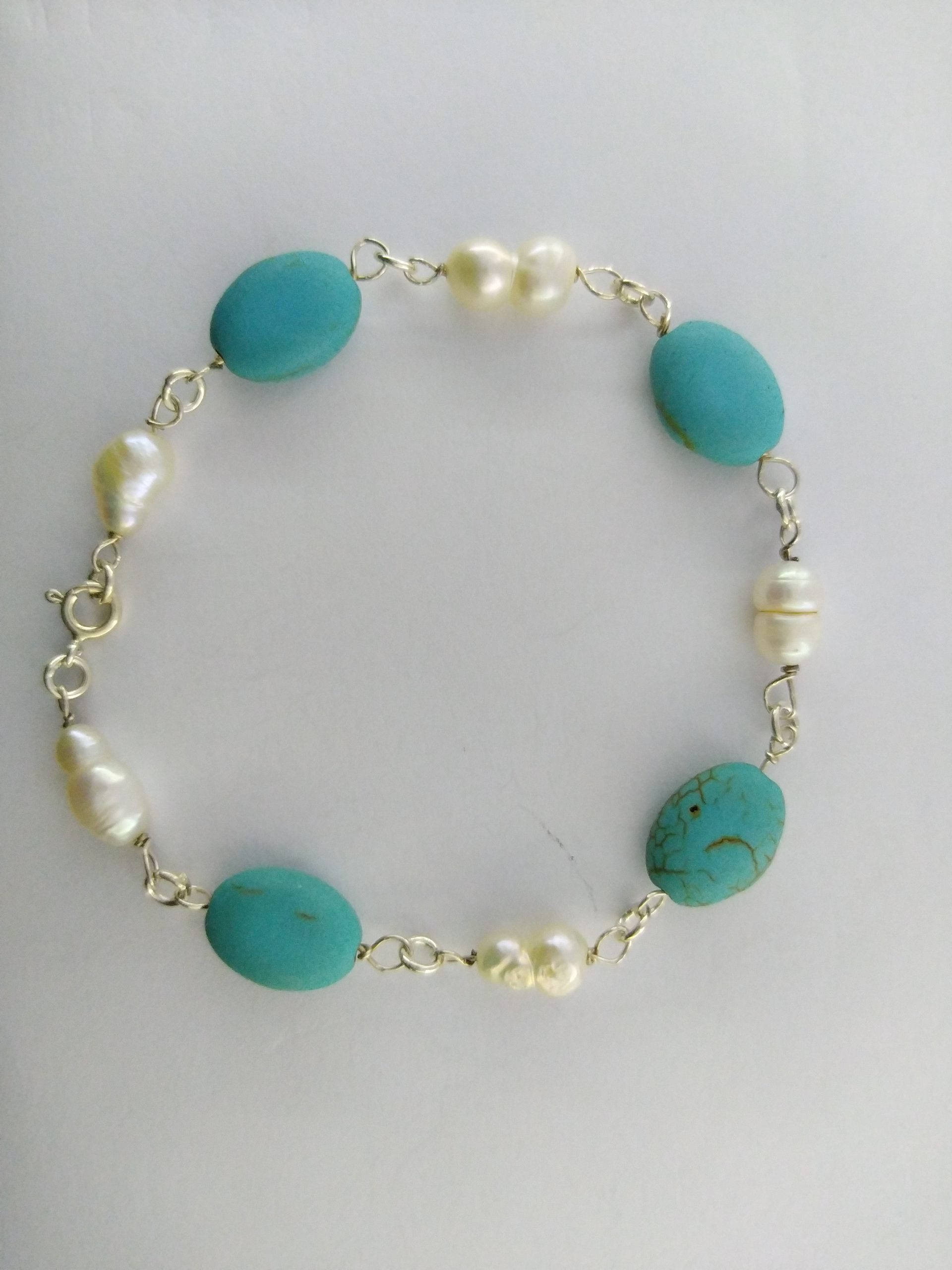 Collar en perla natural, fosil turquesa y ley 925 plata