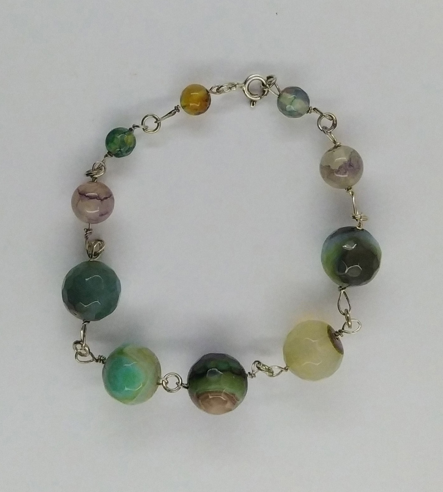 Pulsera elaborada a mano con esferas Ágata verde de 10mm y 6mm engarzado con alambre y argollas en plata ley 925 de 19cm de largo