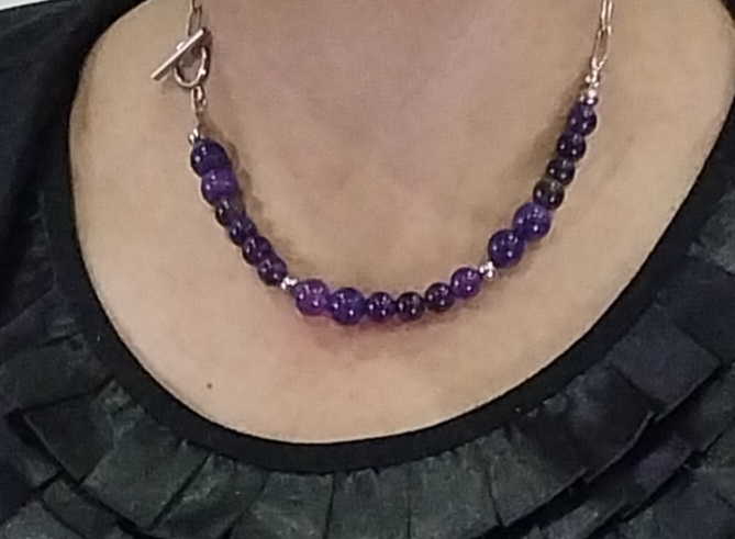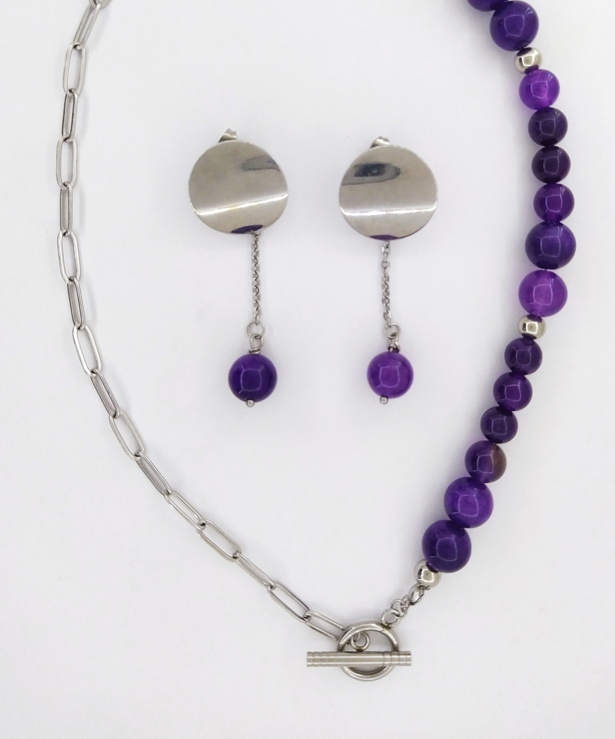 Collar Mitad cadena en acero plateada, mitad piedra redonda numero 8 y 10 amatista, mas topos redondos plateados y una piedra en amatista.
