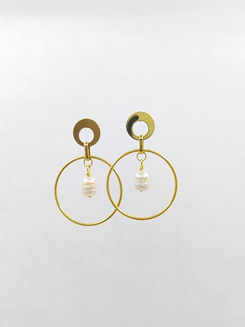 Un par de Pendinetes de aros dorados en acero y perlas de rio