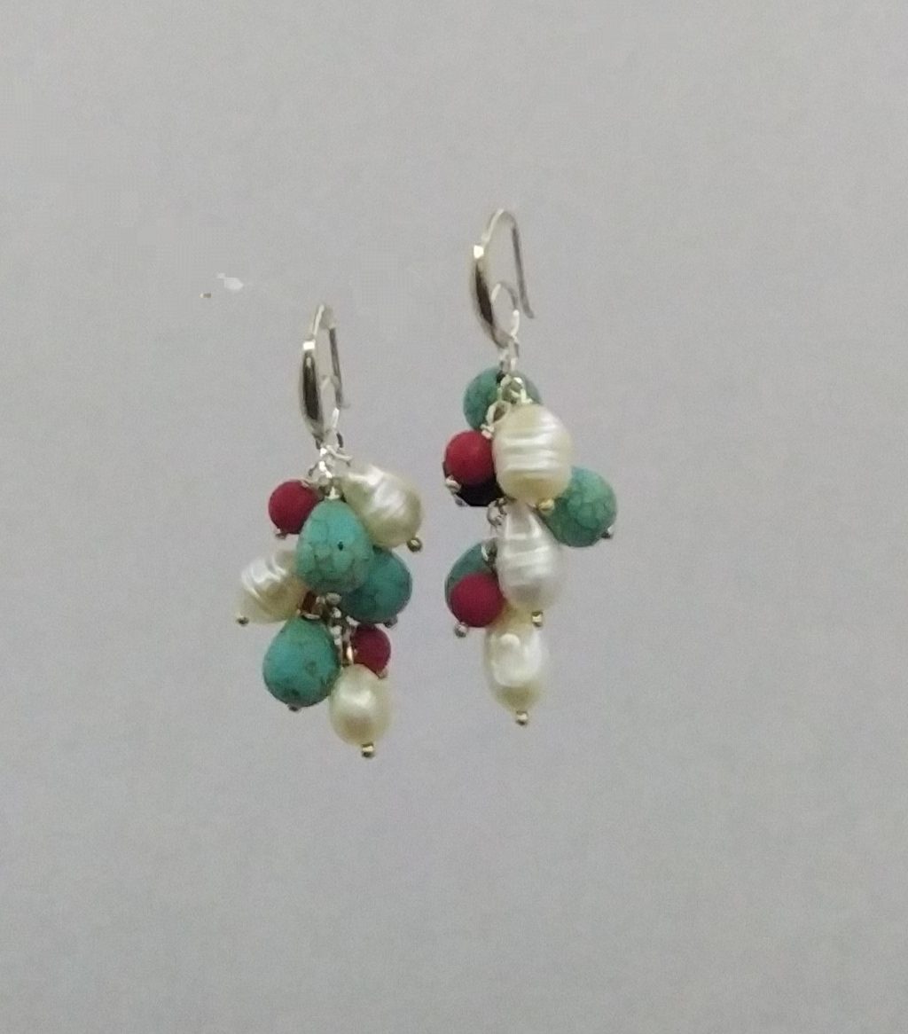 Pendientes en plata ley 925 argos con perla natural, coral y turquesa
