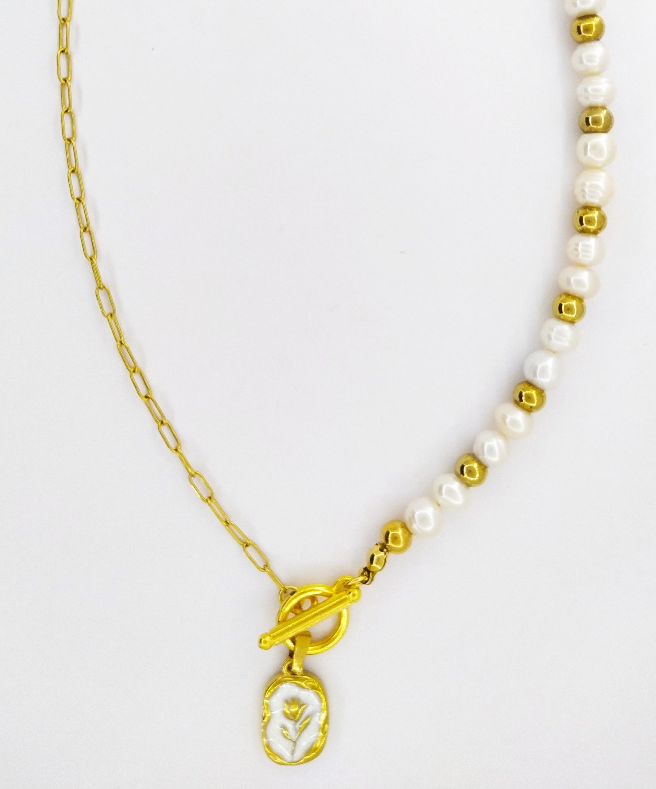 collar en perlas y balines en acero dorado y dije dorado de rosa blanca y la otra mitad del collar en acero dorado. Aire de exclusividad y misticismo