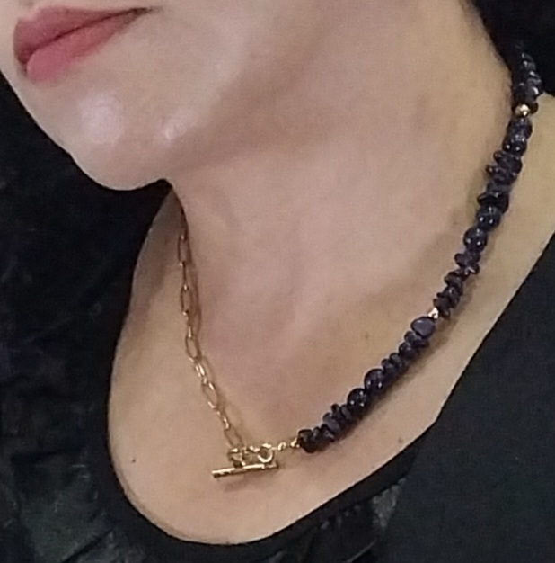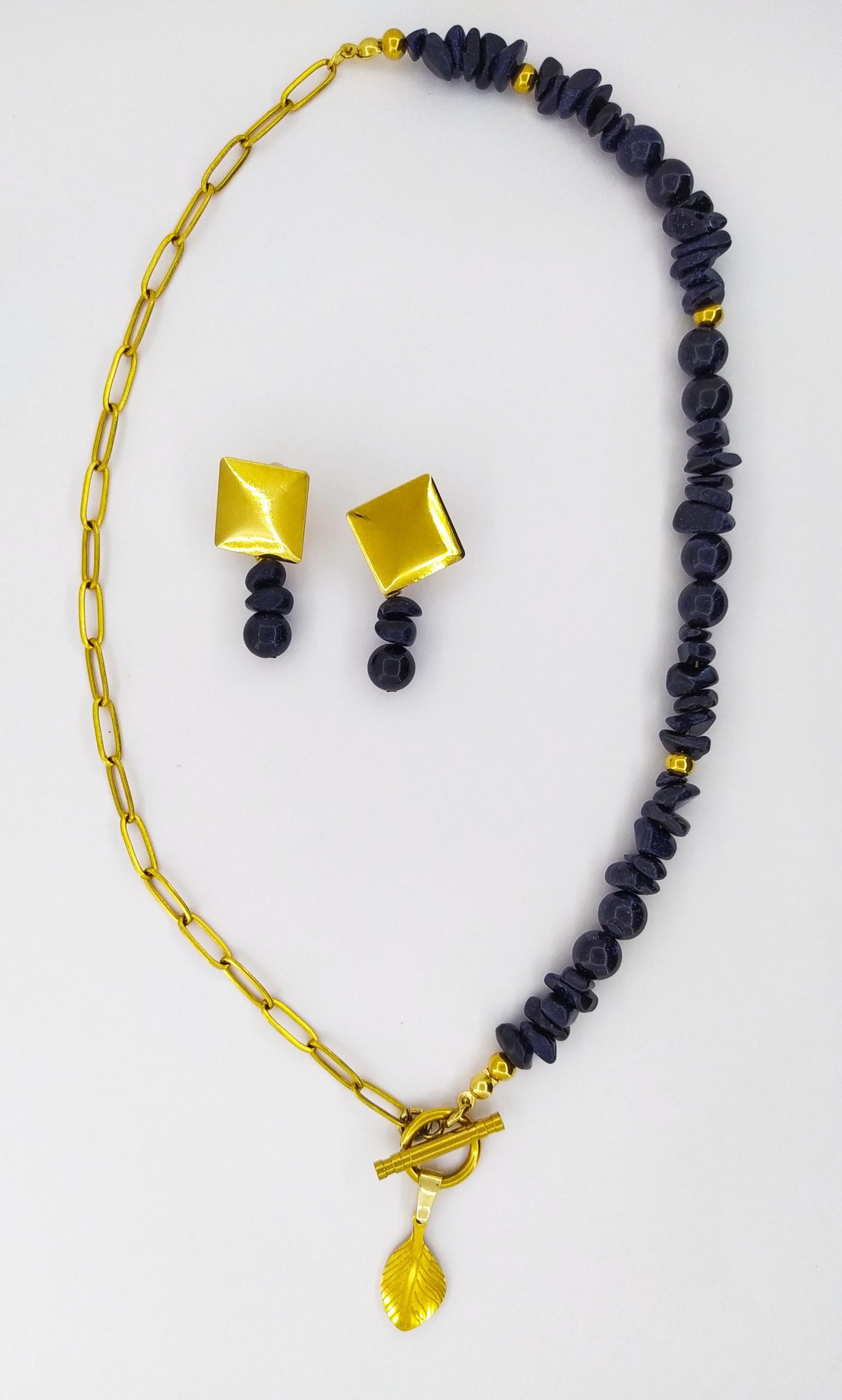 Set de collar y topos que fusiona la fuerza de la naturaleza con el brillo sutil de lo etéreo. Mitad en piedra natural lluvia de plata, que aporta protección y equilibrio energético, y mitad en cadena dorada que realza su elegancia. El dije en forma de hoja dorada simboliza crecimiento, renovación y conexión con lo esencial.