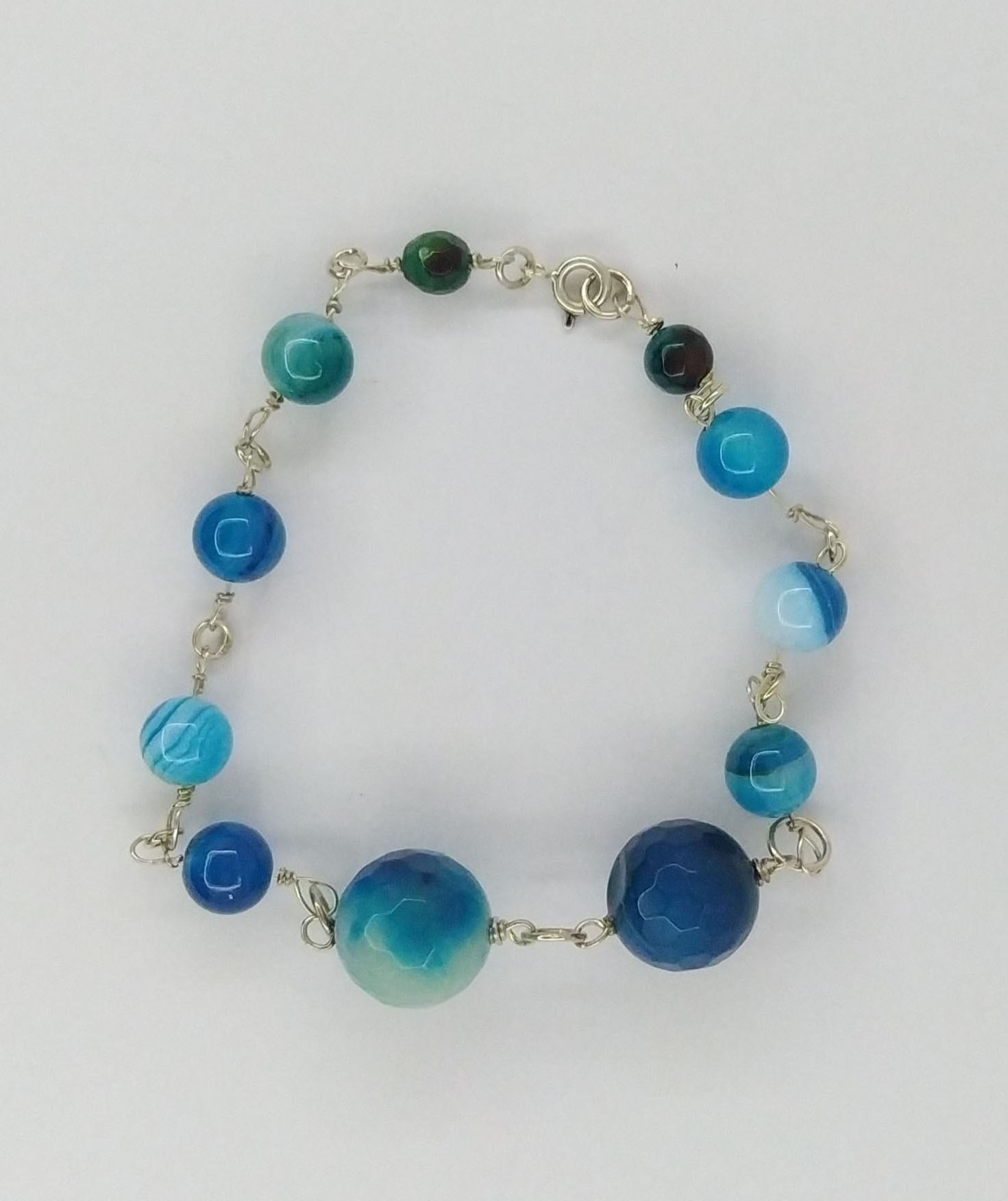 Pulsera elaborada a mano con esferas Ágata azul de 10mm y 6mm engarzado con alambre y argollas en plata ley 925 de 20cm de largo