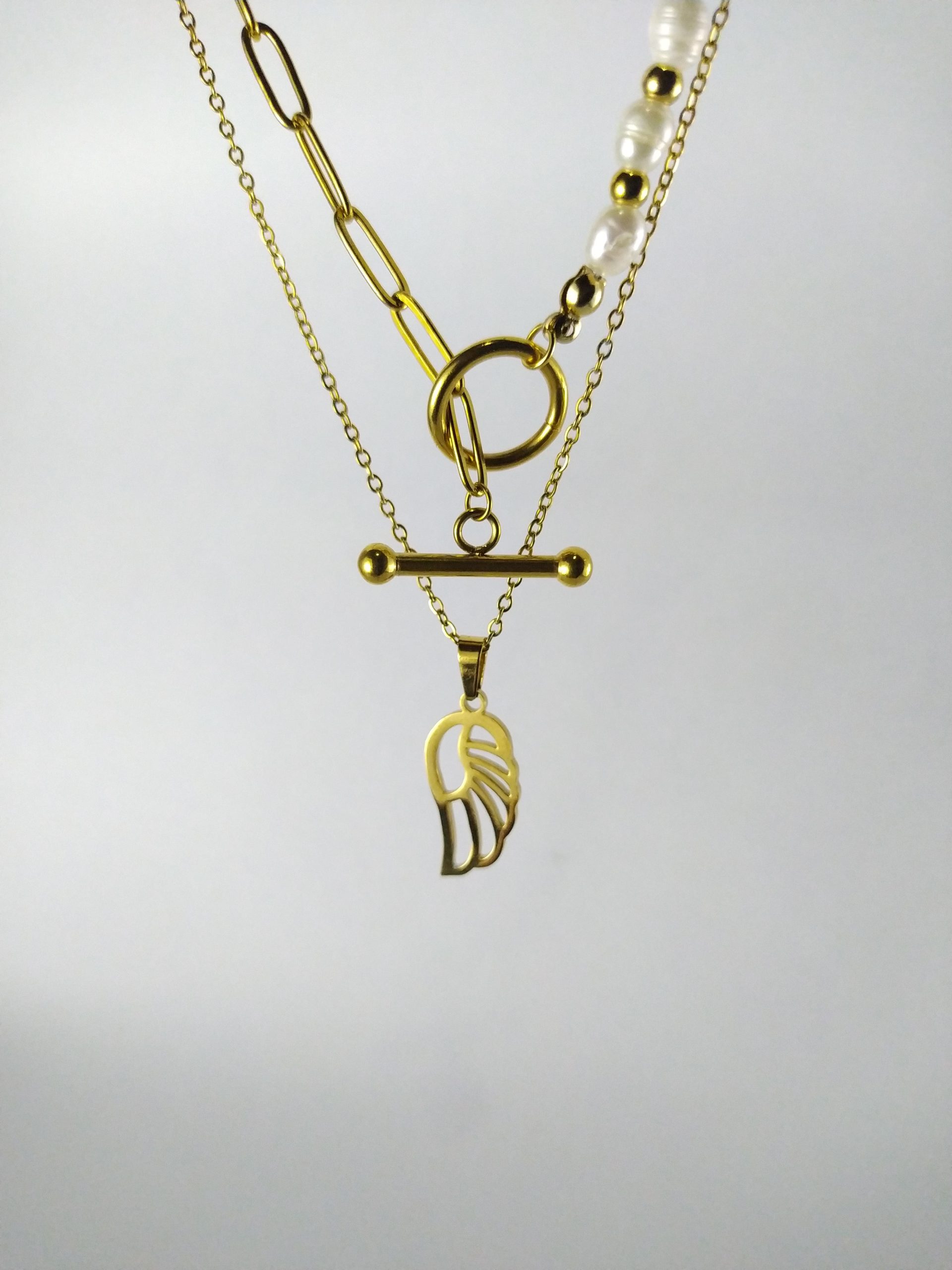 Dos Cadenas en acero dorado una con perlas Naturales, balines en acero y dije de ala 40CM aproximadamente.